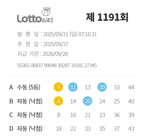 | 1191회 로또 당첨번호, 1등 당첨 판매점(1등 배출점), 당첨 결과 입니다 ( 특이사항 나옴 , 조작 의심 정황 포착 ) (5) | 2025.09.28 |
