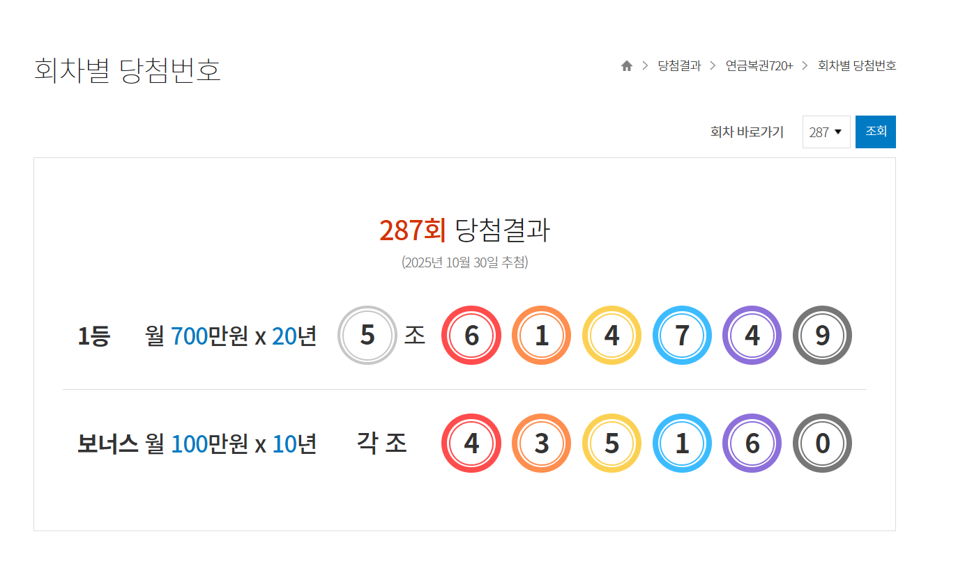 | 288회 연금복권 당첨 번호, 1등 당첨 판매점(1등 배출점), 당첨 결과 입니다 ( 신기한 일 발생 ) (3) | 2025.11.07 |