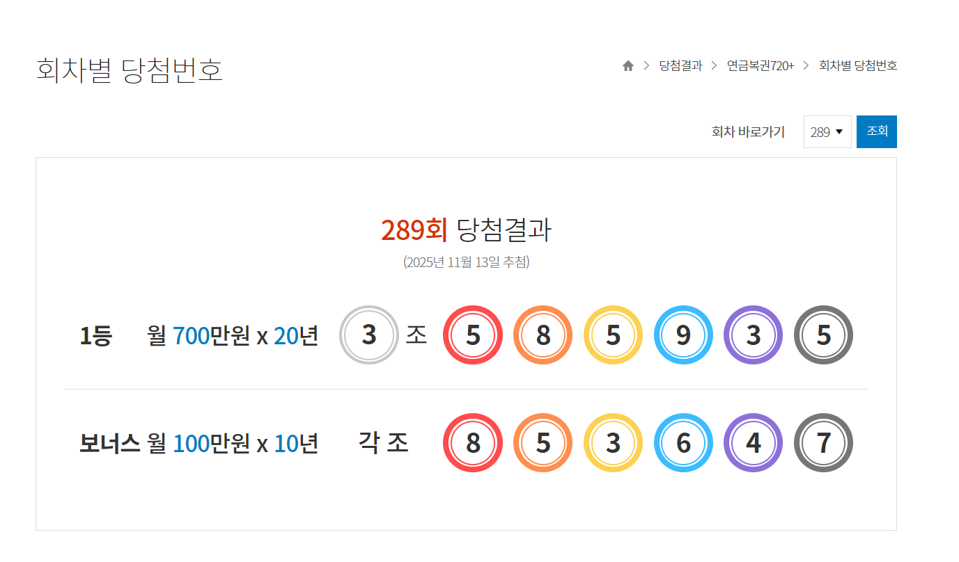 | 290회 연금복권 당첨 번호, 1등 당첨 판매점(1등 배출점), 당첨 결과 입니다 (5) | 2025.11.21 |