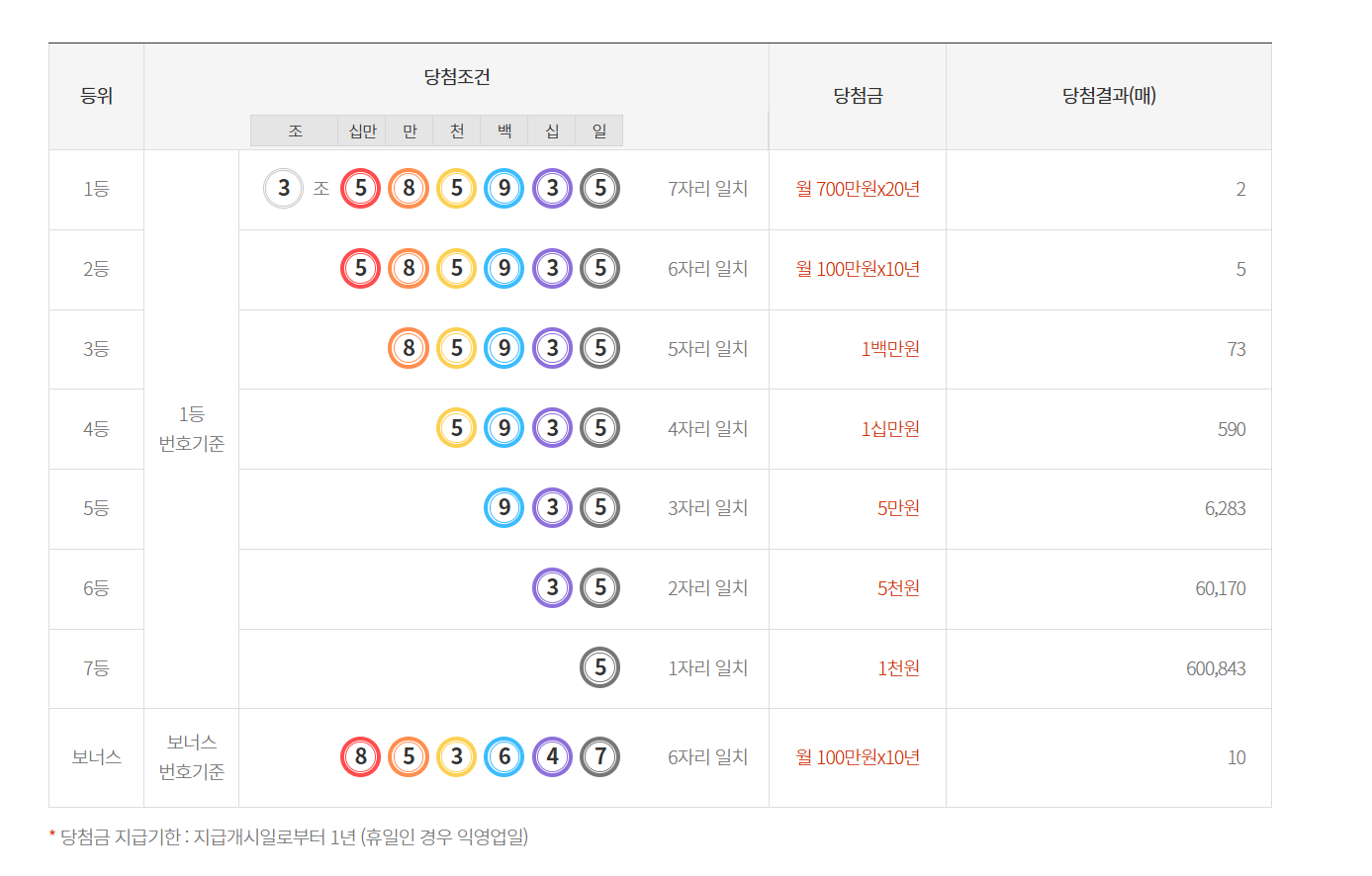 인터넷 당첨자는 조묶음이 아니라 낱개 번호로 구매하신 분 같네요