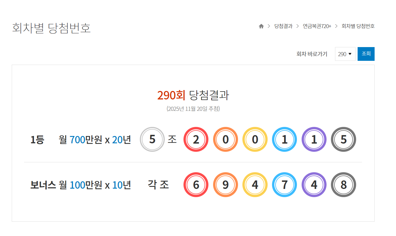 | 291회 연금복권 당첨 번호, 1등 당첨 판매점(1등 배출점), 당첨 결과 입니다 (5) | 2025.11.28 |