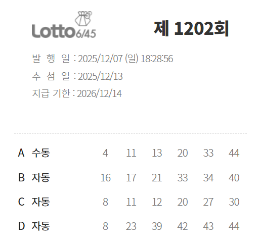 | 1202회 로또 당첨번호, 1등 당첨 판매점(1등 배출점), 당첨 결과 입니다 ( 조작의심사항 나옴 ) (3) | 2025.12.14 |