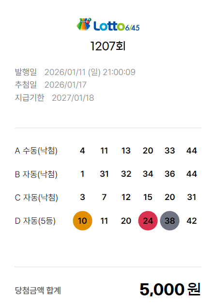 | 로또1208회 로또 구매했습니다, 제 행운번호 보여드립니다, 1등 당첨 감사합니다 (4) | 2026.01.20 |